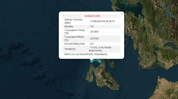 Σεισμός 3,9 βαθμών της κλίμακας Ρίχτερ, σύμφωνα με την αυτόματη λύση του Γεωδυναμικού Ινστιτούτου του Αστεροσκοπείου Αθηνών, σημειώθηκε το πρωί της Τετάρτης (17/9) στις 07:56 κοντά στις βόρειες ακτές της Κεφαλονιάς.