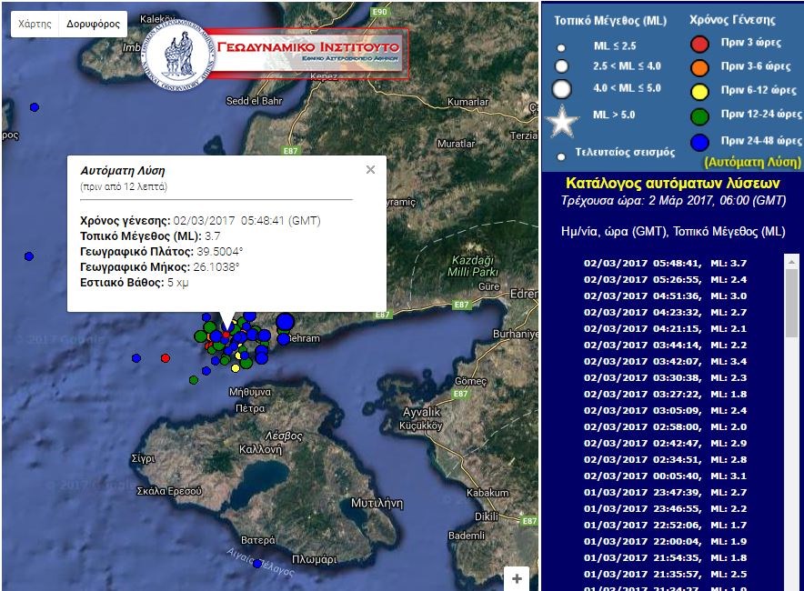 Σεισμική δόνηση 3,9 Ρίχτερ έγινε στις 7:48 το πρωί της Πέμπτης βόρεια της Λέσβου.Σύμφωνα με την αυτόματη, προκαταρκτική λύση του Γεωδυναμικού Ινστιτούτου, η σεισμική δόνηση είχε επίκεντρο 58 χλμ βορειοδυτικά της Μυτιλήνης, ενώ το εστιακό βάθος υπολογίστηκε στα 10 χλμ.Λίγο αργότερα, το Γεωδυναμικό διόρθωσε την πρώτη μέτρηση της σεισμικής δόνησης σε 3,7 Ρίχτερ.
