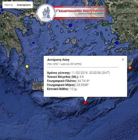 Σεισμική δόνηση μεγέθους 3,9 βαθμών της κλίμακας Ρίχτερ σημειώθηκε στις 22.32 το βράδυ νότια της Κρήτης. Το επίκεντρο του σεισμού εντοπίστηκε στη θαλάσσια περιοχή 35 χιλιόμετρα νοτιοανατολικά του Αγίου Νικολάου, και το εστιακό του βάθος στα 10 χιλιόμετρα.