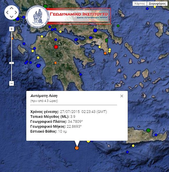 Σεισμός 3,9 Ρίχτερ νοτιοδυτικά της Κρήτης