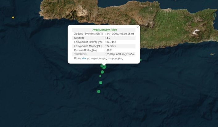 Σεισμός 4 Ρίχτερ έγινε ανοιχτά της Γαύδου. Συγκεκριμένα ο σεισμός έγινε 25 χιλιόμετρα ανατολικά της Γαύδου και έγινε αισθητός και στην Κρήτη. Το εστιακό βάθος ήταν στα 18,2 χιλιόμετρα σύμφωνα με το Γεωδυναμικό Ινστιτούτο.