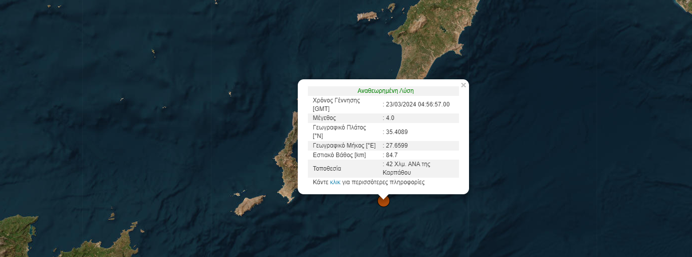 Σύμφωνα με το Γεωδυναμικό Ινστιτούτο το επίκεντρο της δόνησης εντοπίζεται στα 42 χλμ. ανατολικά, νοτιοανατολικά της Καρπάθου, ενώ το εστιακό βάθος υπολογίζεται στα 84,7 χλμ.
