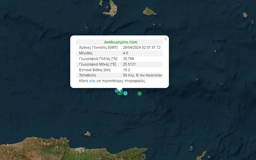 Σύμφωνα με το Γεωδυναμικό Ινστιτούτο το επίκεντρο της δόνησης εντοπίζεται στα 50 χλμ. βόρεια του Ηρακλείου, ενώ το εστιακό βάθος υπολογίζεται στα 15,2 χλμ.