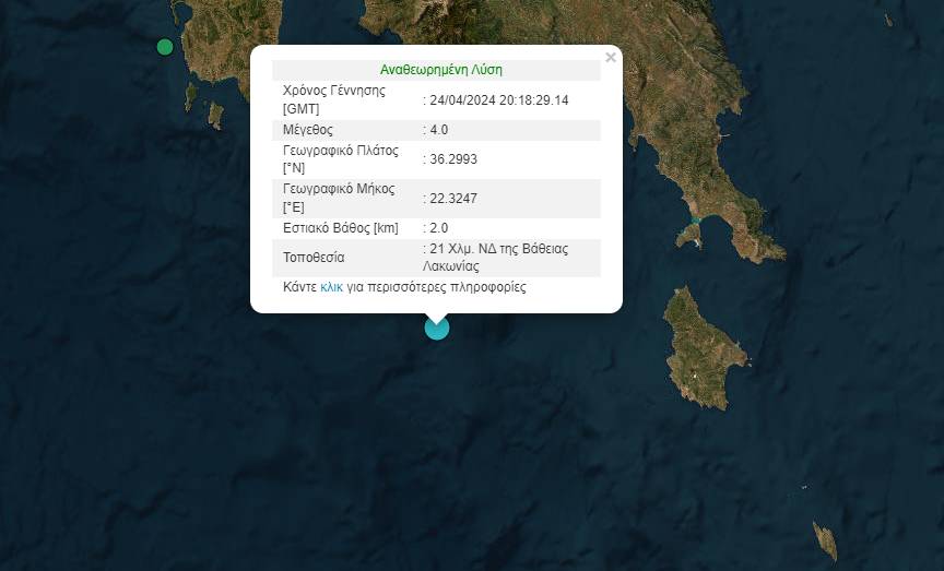 Σεισμός μεγέθους 4 βαθμών της κλίμακας Ρίχτερ σημειώθηκε το βράδυ της Τετάρτης ανοιχτά της Λακωνίας.