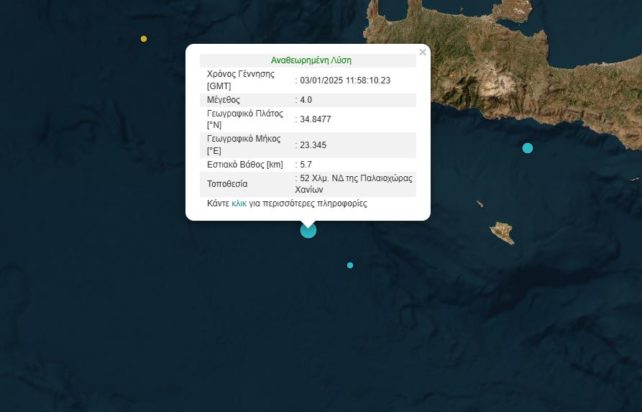 Σεισμός 4 Ρίχτερ στα ανοιχτά της Κρήτης 12 μήνες ago κοινωνία ΚΡΗΤΗ ΣΕΙΣΜΟΣ Σεισμός 4 Ρίχτερ έγινε πριν από λίγο στα ανοιχτά της Κρήτης. Το επίκεντρο εντοπίζεται 52 Χλμ. ΝΔ της Παλαιοχώρας Χανίων.