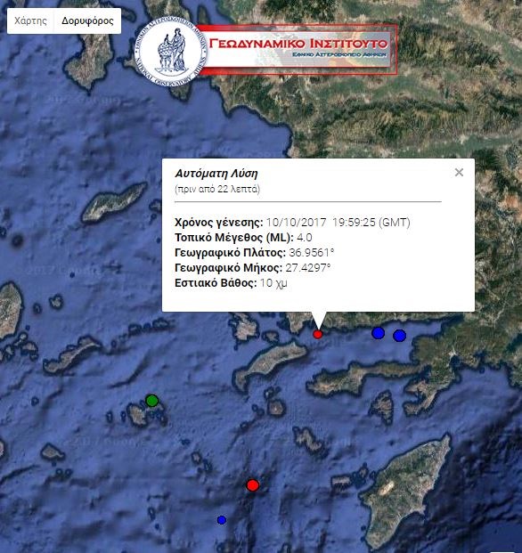 Σεισμική δόνηση 4 βαθμών της κλίμακας Ρίχτερ σημειώθηκε στις 22:59 στην θαλάσσια περιοχή μεταξύ της Κω και της Αλικαρνασσού της Τουρκίας. Το εστιακό βάθος του σεισμού υπολογίζεται στα δέκα χιλιόμετρα, σύμφωνα με το Γεωδυναμικό Ινστιτούτο. Δεν υπάρχουν πληροφορίες για τραυματίες ή ζημιές.