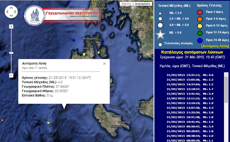 Σεισμός εντάσεως 4 βαθμών της κλίμακας Ρίχτερ σημειώθηκε πριν από λίγα λεπτά στην υποθαλάσσια περιοχή δυτικά της Ζακύνθου.