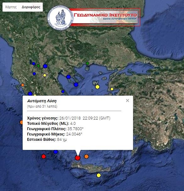 Σεισμική δόνηση μεγέθους 4 βαθμών της κλίμακας Ρίχτερ σημειώθηκε στις 00.09 στη θαλάσσια περιοχή βόρεια της Κρήτης. Σύμφωνα με το Γεωδυναμικό Ινστιτούτο του Εθνικού Αστεροσκοπείου Αθηνών, το επίκεντρο του σεισμού εντοπίστηκε 32 χλμ.βόρεια των Χανίων και το εστιακό του βάθος στα 84 χιλιόμετρα.