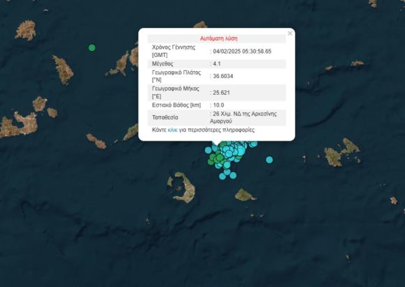 Σεισμός 4,1 Ρίχτερ έγινε στις 7:30 ανοιχτά της Αμοργού. Οι σεισμικές δονήσεις συνεχίστηκαν όλο το βράδυ, κρατώντας τους κατοίκους έξω από τα σπίτια τους, καθώς πολλοί επέλεξαν να κοιμηθούν στα αυτοκίνητά τους.