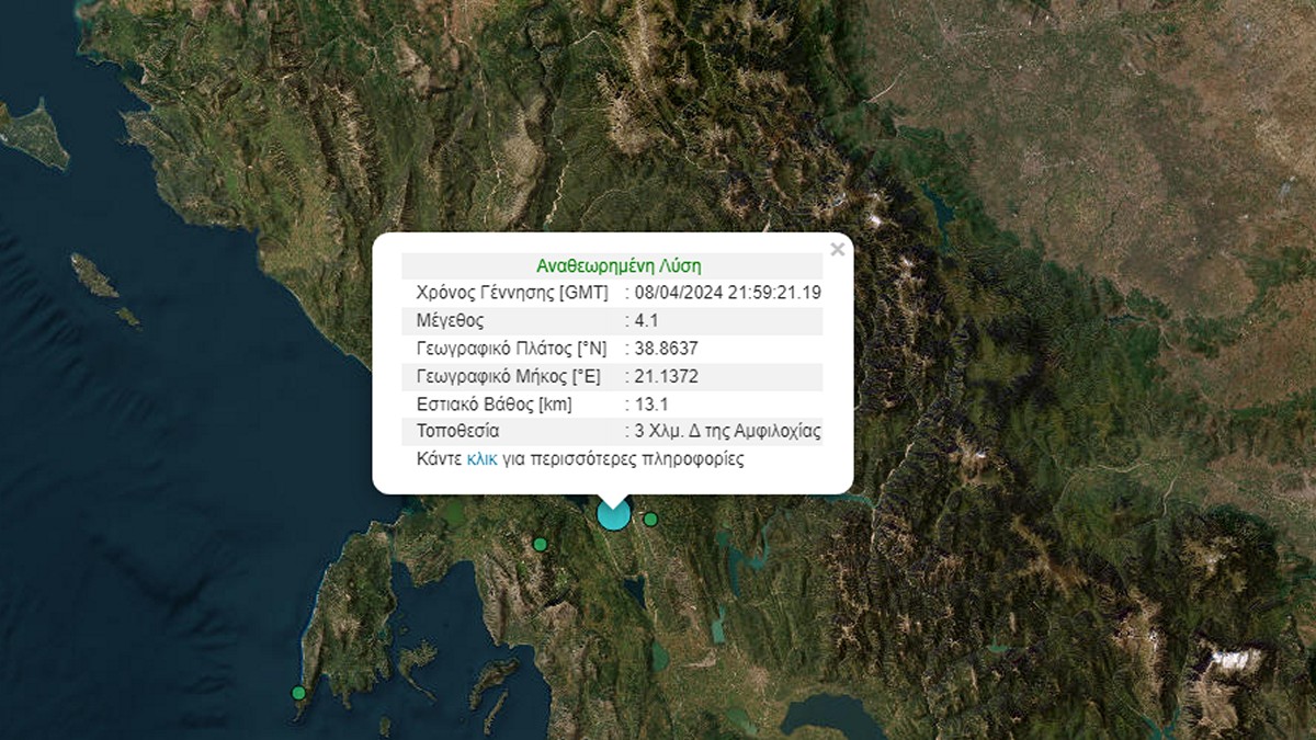 Σεισμός 4,1 βαθμών της κλίμακας Ρίχτερ σημειώθηκε μία ώρα μετά τα μεσάνυχτα της Δευτέρας στην Αμφιλοχία.