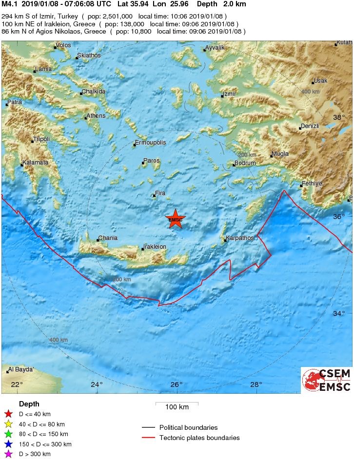 Σεισμική δόνηση μεγέθους 4,1 Ρίχτερ σύμφωνα με την πρώτη καταγραφή του Ευρωμεσογειακού Σεισμολογικού Κέντρου σημειώθηκε στις 9:06 το πρωί.