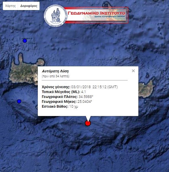Σεισμική δόνηση 4,1 βαθμών της κλίμακας Ρίχτερ σημειώθηκε στις 00.15 στην Κρήτη, σύμφωνα με την προκαταρκτική μελέτη του Γεωδυναμικού Ινστιτούτου του Εθνικού Αστεροσκοπείου Αθηνών. Το επίκεντρο της δόνησης υπολογίζεται στη θαλάσσια περιοχή κοντά στο Τυμπάκι και το εστιακό της βάθος στα 10 χλμ.