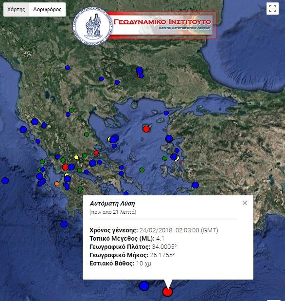 Ασθενής σεισμική δόνηση 4,1 βαθμών της κλίμακας Ρίχτερ σημειώθηκε στις 04.03 στον θαλάσσιο χώρο νότια της Κρήτης, σύμφωνα με την προκαταρκτική μελέτη του Γεωδυναμικού Ινστιτούτου του Εθνικού Αστεροσκοπείου Αθηνών.