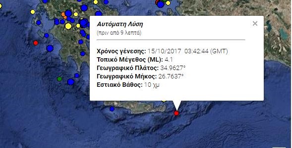 Συγκεκριμένα, η σεισμική δόνηση σημειώθηκε στις 6.42.44. Ήταν, όπως προαναφέραμε, 4,1 Ρίχτερ σύμφωνα με την αυτόματη, προκαταρκτική λύση του Γεωδυναμικού Ινστιτούτου του Αστεροσκοπείου Αθηνών σε εστιακό βάθος 10 χιλιομέτρων. Όσο για το επίκεντρο του σεισμού, εντοπίζεται στα 65 χιλιόμετρα νοτιοανατολικά της Σητείας.