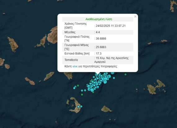 Σεισμός 4,4 βαθμών της κλίμακας Ρίχτερ σημειώθηκε το μεσημέρι της Δευτέρας (24/2) στη θαλάσσια περιοχή ανοιχτά της Αμοργού.