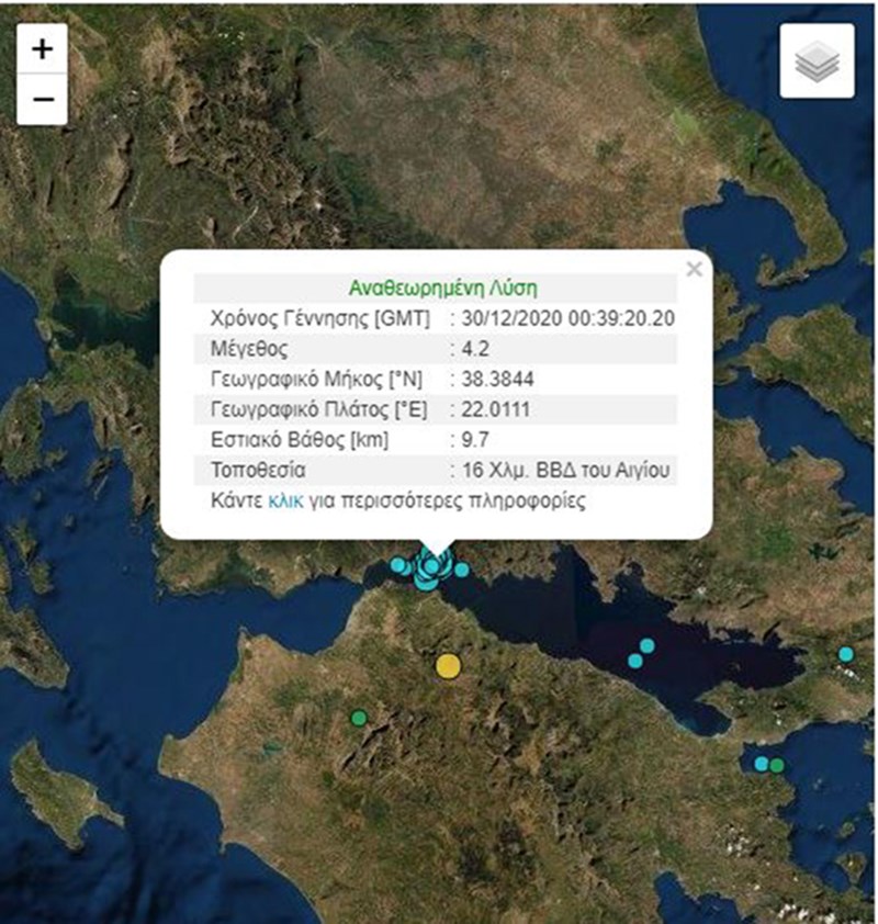 Η δόνηση είχε εστιακό βάθος 9,7 χλμ, επίκεντρο που εντοπίζεται στα 16 χλμ.βορειοδυτικά του Αιγίου και έγινε αισθητή σε περιοχές της Αχαΐας και της Αιτωλοακαρνανίας.