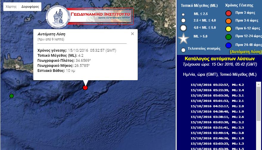 Σεισμός 4,2 Ρίχτερ εκδηλώθηκε πριν από λίγα λεπτά στη θαλάσσια περιοχή νοτιοανατολικά της Κρήτης.