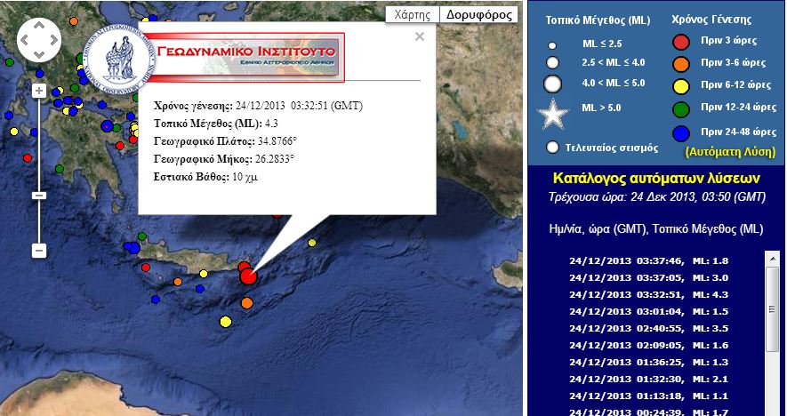 Σεισμός εντάσεως 4,3 βαθμών της κλίμακας Ρίχτερ σημειώθηκε στις 05:32 στη θαλάσσια περιοχή νότια της Κρήτης.