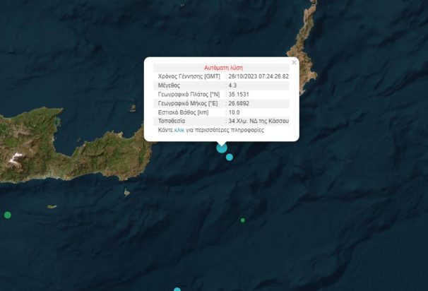 Σεισμός 4,3 Ρίχτερ έγινε πριν από λίγο στον θαλάσσιο χώρο ανοιχτά της Κάσου. Σύμφωνα με την ανάλυση του Γεωδυναμικού Ινστιτούτου Αθηνών, το εστιακό βάθος εντοπίζεται στα 10 χλμ, ενώ το επίκεντρο 34 χλμ. νοτιο-δυτικά του νησιού.