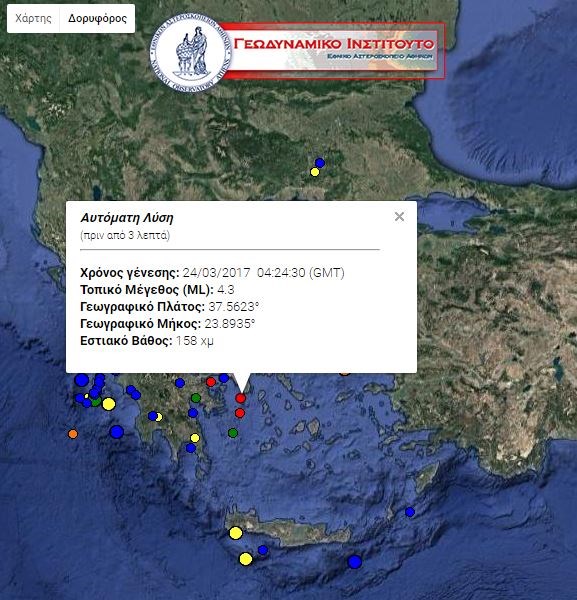 Σεισμική δόνηση μεγέθους 4,3 βαθμών της κλίμακας Ρίχτερ σημειώθηκε στις 6.24, σε απόσταση 50 χλμ νοτίως της Αττικής.