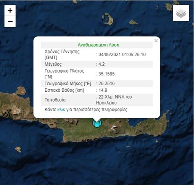 Σεισμική δόνηση μεγέθους 4,2 βαθμών της κλίμακας Ρίχτερ σημειώθηκε τα ξημερώματα της Παρασκευής στις 04.05 νοτιοανατολικά του Ηρακλείου, σύμφωνα με τις μετρήσεις του Γεωδυναμικού Ινστιτούτου.
