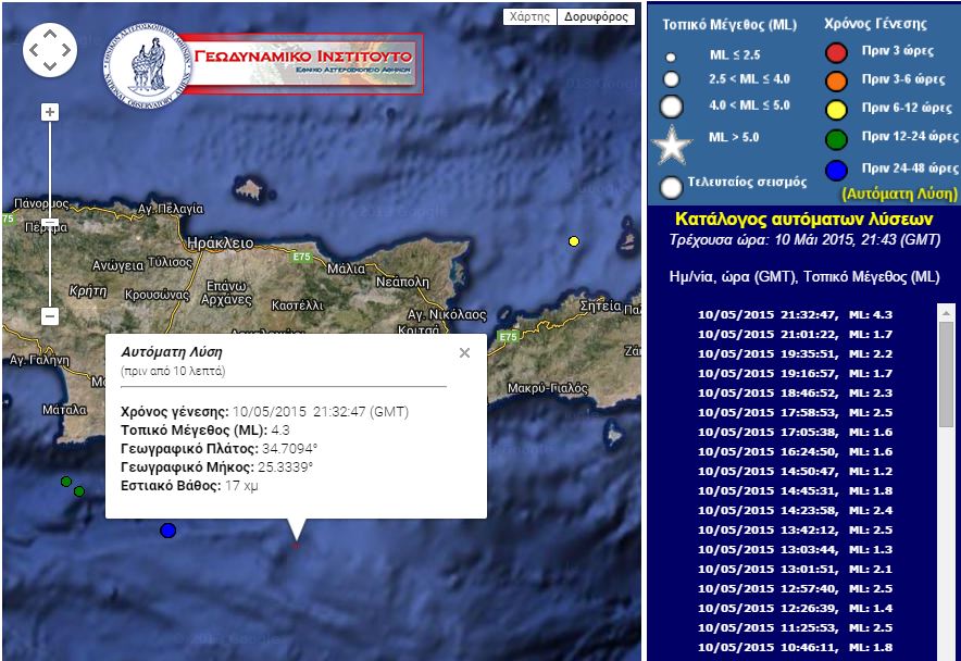 Σεισμός εντάσεως 4,3 Ρίχτερ σημειώθηκε πριν από λίγα λεπτά στην υποθαλάσσια περιοχή νότια της Κρήτης.