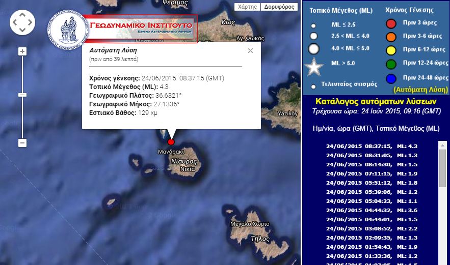 Σύμφωνα με την αυτόματη, προκαταρκτική μέτρηση του Γεωδυναμικού Ινστιτούτου, ο σεισμός εκδηλώθηκε στις 11:37 σήμερα το πρωί 4 χιλιόμετρα δυτικά-βορειοδυτικά της Νισύρου και νότια της Κω.