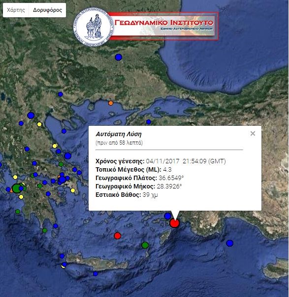 Σεισμός 4,3 Ρίχτερ βορειοανατολικά της Ρόδου