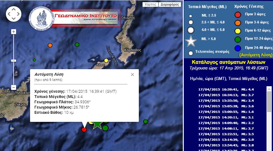 Συνεχίζεται η μετασεισμική ακολουθία στην υποθαλάσσια περιοχή μεταξύ της Κρήτης και της Κάσου. Πριν απο λίγα λεπτά, ένας νέος σεισμός, εντάσεως 4,4 βαθμών της κλίμακας Ρίχτερ εκδηλώθηκε 46 χιλιόμετρα νότια νοτιοδυτικά της Κάσου.