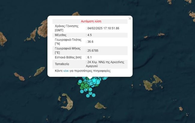 Νέος σεισμός έντασης 4,5 βαθμών της κλίμακας Ρίχτερ σημειώθηκε πριν από λίγο στη θαλάσσια περιοχή της Αμοργού.