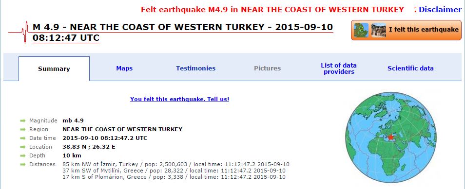 Σεισμός 4,5 Ρίχτερ σημειώθηκε πριν από λίγα λεπτά στη θαλάσσια περιοχή, 39 χιλιόμετρα νοτιοδυτικά της Μυτιλήνης στη Λέσβο.