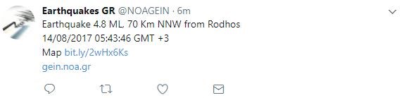Το επίκεντρο εντοπίζεται στα 70 χιλιόμετρα βόρεια-βορειοδυτικά της Ρόδου και στα 72 χιλιόμετρα βορειοανατολικά της Κω.Δείτε το tweet του Γεωδυναμικού Ινστιτούτου: