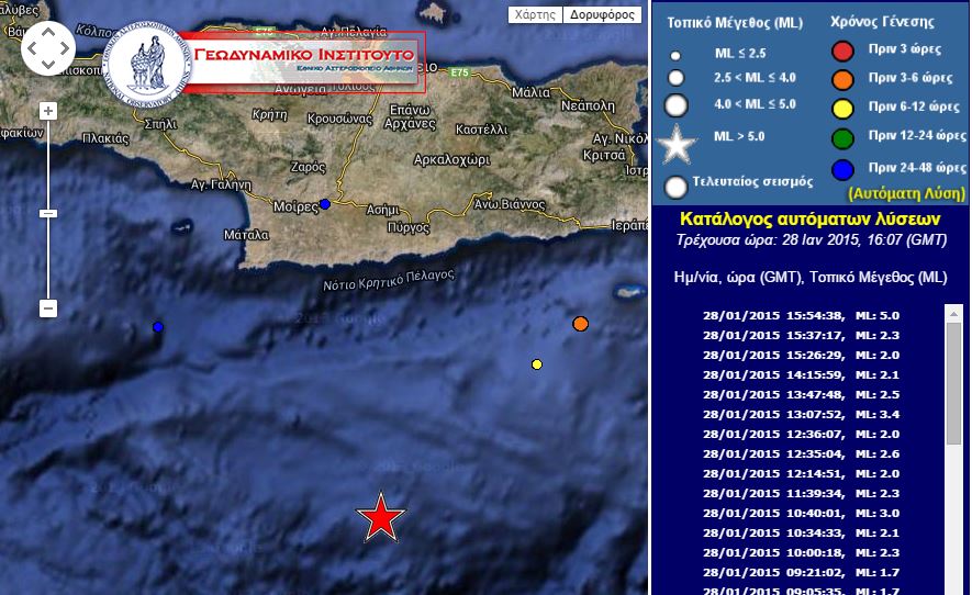 Σεισμός εντάσεως 5 Ρίχτερ σημειώθηκε πριν από λίγα λεπτά στη θαλάσσια περιοχή νότια της Κρήτης.