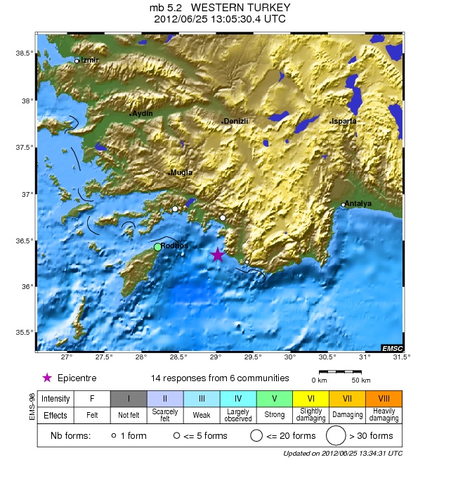 Δείτε την ταυτότητα του σεισμούMagnitude mb 5.2Region WESTERN TURKEYDate time 2012-06-25 13:05:30.0 UTCLocation 36.34 N ; 29.02 EDepth 48 kmDistances 285 km SE Izmir (pop 2,500,603 ; local time 16:05:30.4 2012-06-25)160 km S Denizli (pop 313,238 ; local time 16:05:30.4 2012-06-25)32 km S Fethiye (pop 60,437 ; local time 16:05:30.4 2012-06-25)