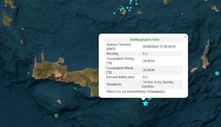 Σεισμός 5,3 βαθμών της κλίμακας Ρίχτερ σημειώθηκε το μεσημέρι της Τρίτης (3/6) στη θαλάσσια περιοχή νότια της Ιεράπετρας, στην Κρήτη.