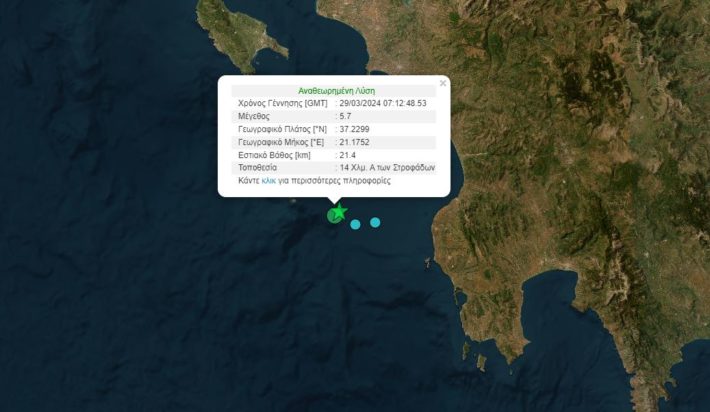 Ανακοίνωση σχετικά με τον ισχυρό σεισμό μεγέθους 5,7 βαθμών στην κλίμακα Ρίχτερ ανατολικά των Στροφάδων, εξέδωσε το Γεωδυναμικό Ινστιτούτο του Εθνικού Αστεροσκοπείου Αθηνών.