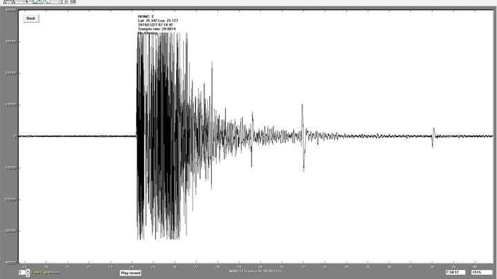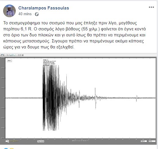 “Το σεισμογράφημα του σεισμού που μας έπληξε πριν λίγο, μεγέθους περίπου 6,1 R. Ο σεισμός λόγω βάθους (55 χιλμ.) φαίνεται ότι έγινε κοντά στο όριο των δυο πλακών και γι’ αυτό ίσως θα πρέπει να περιμένουμε και κάποιους μετασεισμούς. Σιγουρα πρέπει να περιμένουμε ακόμα κάποιες ώρες για να δουμε πως θα εξελιχθεί” έγραψε στον λογαριασμό του στο Facebook ο γεωλόγος του Μουσείου Φυσικής Ιστορίας, Χαράλαμπος Φασούλας.
