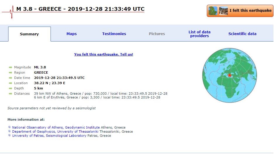 Σύμφωνα με το Ευρωμεσογειακό Ινστιτούτο ο σεισμός ήταν μεγέθους 3,8 Ρίχτερ με επίκεντρο 39 χιλιόμετρα βόρεια της ΑΘήνας,στο χωριό Ερυθρές και εστιακό βάθος τα 5 χιλιόμετρα.