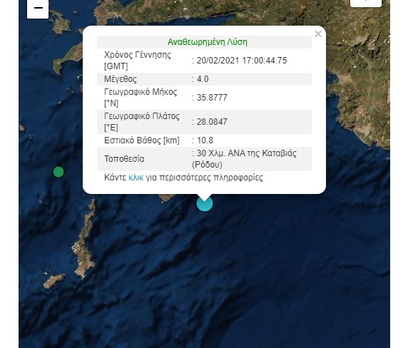 Σεισμός με μέγεθος 4 βαθμούς στην κλίμακα Ρίχτερ σημειώθηκε στις 19:00, σε απόσταση 442 χιλιομέτρων ΑΝΑ της Αθήνας. Σύμφωνα με το Γεωδυναμικό Ινστιτούτο του Εθνικού Αστεροσκοπείου Αθηνών το επίκεντρο της δόνησης εντοπίζεται στο θαλάσσιο χώρο 20 χιλιόμετρα ανατολικά της Καταβιάς Ρόδου.