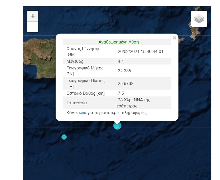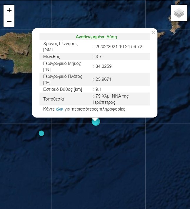 Δύο σεισμοί σημειώθηκαν μέσα σε λίγη ώρα ανοιχτά της Ιεράπετρας. Ο πρώτος, στις 17.46, είχε σύμφωνα με το Γεωδυναμικό Ινστιτούτο μέγεθος 4,2 βαθμούς της κλίμακας Ρίχτερ με επίκεντρο θαλάσσιο χώρο 78 χλμ ΝΝΑ της Ιεράπετρας και εστιακό βάθος 7,5 χλμ. Στη συνέχεια σημειώθηκε σεισμική δόνηση μεγέθους 3,7 βαθμών της κλίμακας Ρίχτερ με επίκεντρο 79 χλμ ΝΝΑ της Ιεράπετρας και εστιακό βάθος 9,1 χλμ.