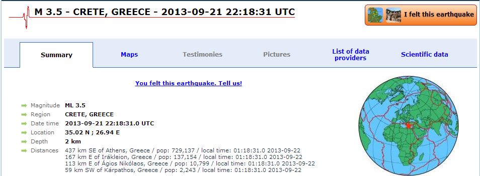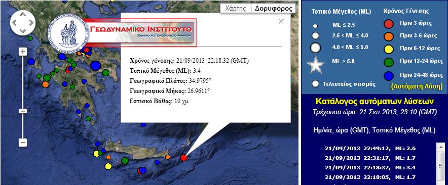 Σύμφωνα με προκαταρκτική εξέταση του Γεωδυναμικού Ινστιτούτου του Εθνικού Αστεροσκοπείου Αθηνών, η σεισμική δόνηση σημειώθηκε στη 01:18 και το επίκεντρο της εντοπίστηκε 40 χιλιόμετρα νότια της Κάσου.