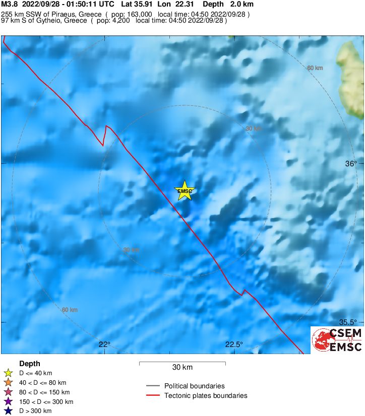 Το ακριβές επίκεντρο τη δόνησης, σύμφωνα με την εκτίμηση του EMSC εντοπίζεται στα 97 χλμ. νότια του Γυθείου.