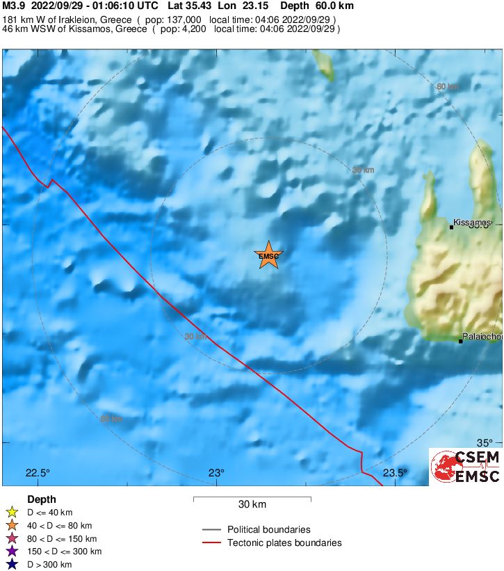 Σεισμός μεγέθους 3,9 βαθμών της κλίμακας Ρίχτερ, σημειώθηκε τα ξημερώματα της Πέμπτης (29/9), στις 04:06, σε υποθαλάσσια περιοχή, δυτικά της Κρήτης, σύμφωνα με την αναθεωρημένη λύση του Ευρωπαϊκού – Μεσογειακού Σεισμολογικού Κέντρου (EMSC)