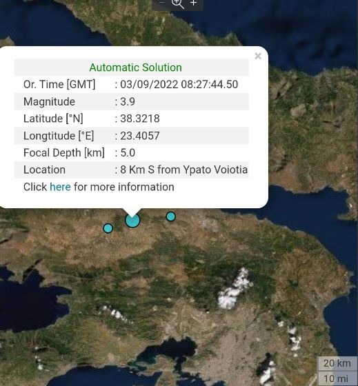 Σημειώνεται ότι σύμφωνα με την αρχική αυτόματη λύση από το Γεωδυναμικό Ινστιτούτο, το εστιακό βάθος του σεισμού εντοπίζεται στα 5 χλμ.