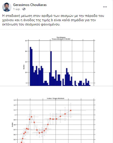 «Η σταδιακή μείωση στον αριθμό των σεισμών με την πάροδο του χρόνου και η άνοδος της τιμής b είναι καλά σημάδια για την εκτόνωση του σεισμικού φαινομένου», αναφέρει στο post του ο κ. Χουλιάρας συνοδεύοντας την ανάρτησή του με δύο φωτογραφίες.