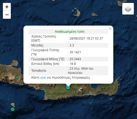 Σεισμός μεγέθους 3,3 βαθμών της κλίμακας Ρίχτερ σημειώθηκε σε απόσταση 23 χλμ. ΝΝΑ του Ηρακλείου. Σύμφωνα με το Γεωδυναμικό Ινστιτούτο του Εθνικού Αστεροσκοπείου Αθηνών, το εστιακό βάθος ήταν στα 16,9 χλμ.