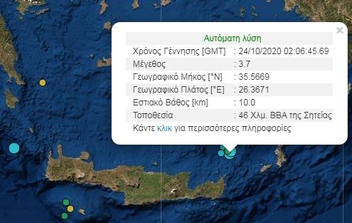 Σεισμική δόνηση μεγέθους 3,7 βαθμών της κλίμακας Ρίχτερ σημειώθηκε λίγα λεπτά μετά τις 5 τα ξημερώματα του Σαββάτου στον θαλάσσιο χώρο βορειοανατολικά της Κρήτης.