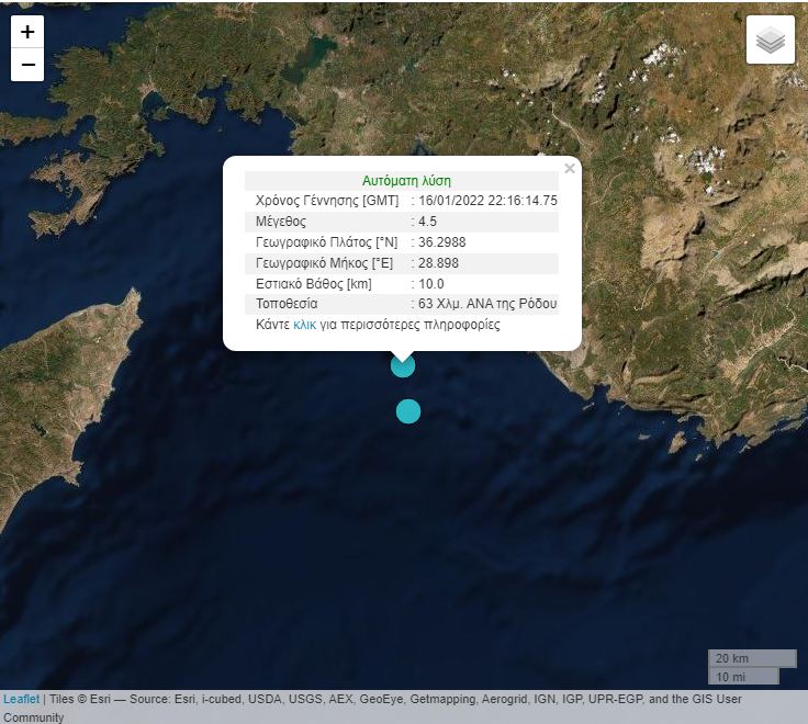 Σεισμός σημειώθηκε λίγο μετά τα μεσάνυχτα στα ανοιχτά της Ρόδου. Σύμφωνα με την Αυτόματη Λύση του Γεωδυναμικού Ινστιτούτου Αθηνών ο σεισμός είχε μέγεθος 4,5 Ρίχτερ.