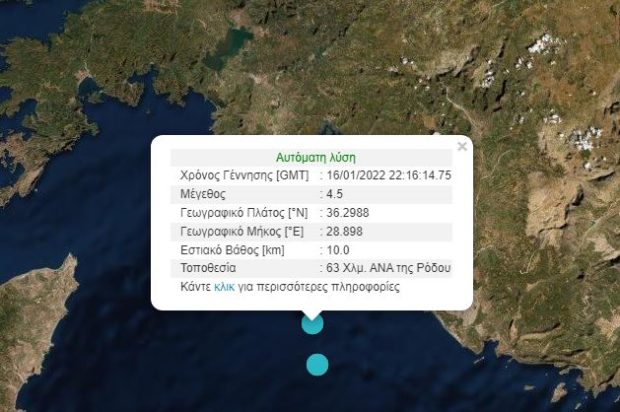 Σεισμός σημειώθηκε λίγο μετά τα μεσάνυχτα στα ανοιχτά της Ρόδου. Σύμφωνα με την Αυτόματη Λύση του Γεωδυναμικού Ινστιτούτου Αθηνών ο σεισμός είχε μέγεθος 4,5 Ρίχτερ.