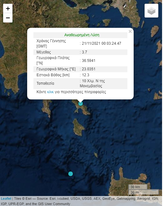 Σεισμός μεγέθους 3,7 βαθμών της κλίμακας Ρίχτερ σημειώθηκε τα ξημερώματα της Κυριακής, στις 02:03, σε απόσταση 10χλμ. νότια της Μονεμβασιάς.